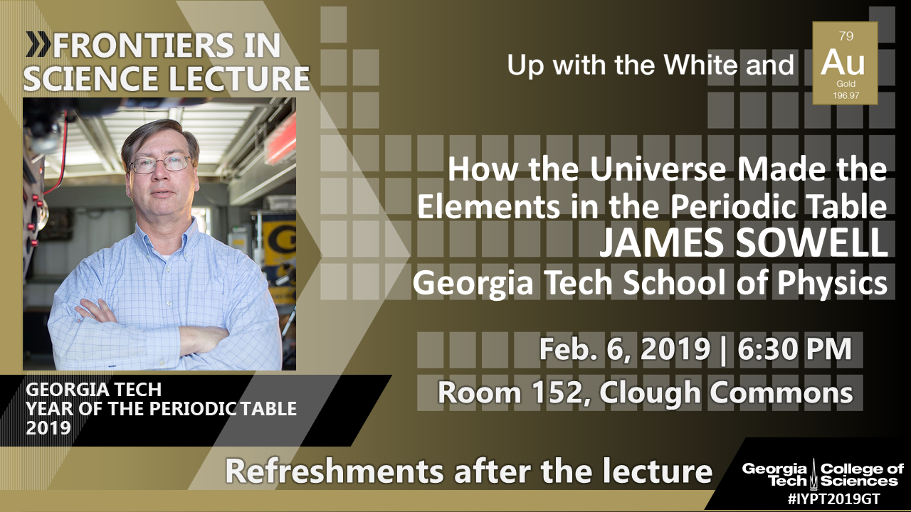 Abstract The creation of the elements in the universe took billions of years and required various processes. The first few minutes of the big bang produced only hydrogen (H) and helium (He). No new elements were formed until a few hundred million years later when the first generation of stars were born and they started fusing H and He into slightly higher-mass elements, such as carbon and oxygen. Various fusion reactions by multiple generations of stars eventually created elements up to iron (Fe). However, normal stars cannot produce elements beyond Fe. Creation of elements heavier than Fe required the cataclysmic explosions of supernovas. These violent deaths of massive stars not only completed the natural elements in the periodic table. They also enabled human life, because certain life processes require heavy elements. About the Speaker James “Jim” Sowell is an astronomer at Georgia Tech and the director of the Georgia Tech Observatory. He has taught Georgia Tech’s two Introductory Astronomy courses for 27 years and the advanced Stellar Astrophysics course for 20 years. He won the inaugural CETL Undergraduate Educator Award in 2009. He often performs public outreach and education, including the widely popular, monthly Public Nights at the Observatory; presentations at schools; and workshops for K-12 teachers. He developed the Aloha Telescope. This remotely controlled facility in Hawaii allows Atlanta area K-12 teachers and students to view live images of the Moon during regular school hours. Sowell earned B.S. and M.S. degrees from Vanderbilt University and a Ph.D. from the University of Michigan. He joined Georgia Tech in 1989. About Frontiers in Science Lectures Lectures in this series are intended to inform, engage, and inspire students, faculty, staff, and the public on developments, breakthroughs, and topics of general interest in the sciences and mathematics. Lecturers tailor their talks for nonexpert audiences.